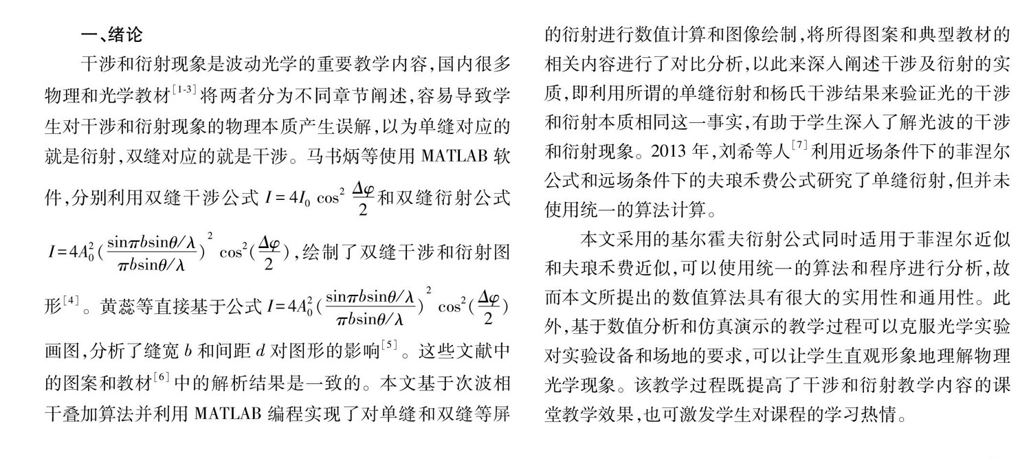 摘要:干涉和衍射是波动光学课程的核心内容,概念难、计算复杂。本文基于基尔霍夫衍射公式,利用次波相干叠加算法和MATTJAB软件通过数值计算得到光照射到单缝、双缝等障碍物后的图案,给学生演示所获得的数值计算结果和典型光学教材中的解析结果吻合良好,让学生直观认识到单缝衍射和双缝干涉图案均可利用基尔霍夫衍射公式计算得到,进一步明确了所谓光的干涉和衍射实际上都是次波相干叠加的结果,在物理上并没有本质的差异。本文提出了抓住主要矛盾舍去次要矛盾的教学思路分别讲解干涉和衍射,继而前后呼应,并用统一算法获得典型孔径的衍射图案来讲解双缝衍射和光栅衍射。该教学手段有助于提高学生对干涉、衍射以及对复振幅线性叠加等物理现象的辨析和理解。