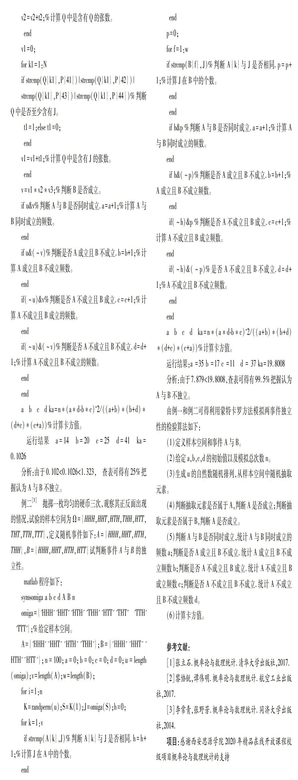 本文利用蒙特卡罗法求事件的概率,对两事件独立性进行检验,并给出相应的Matlab程序,从而使得学生更深入理解事件独立性概念。