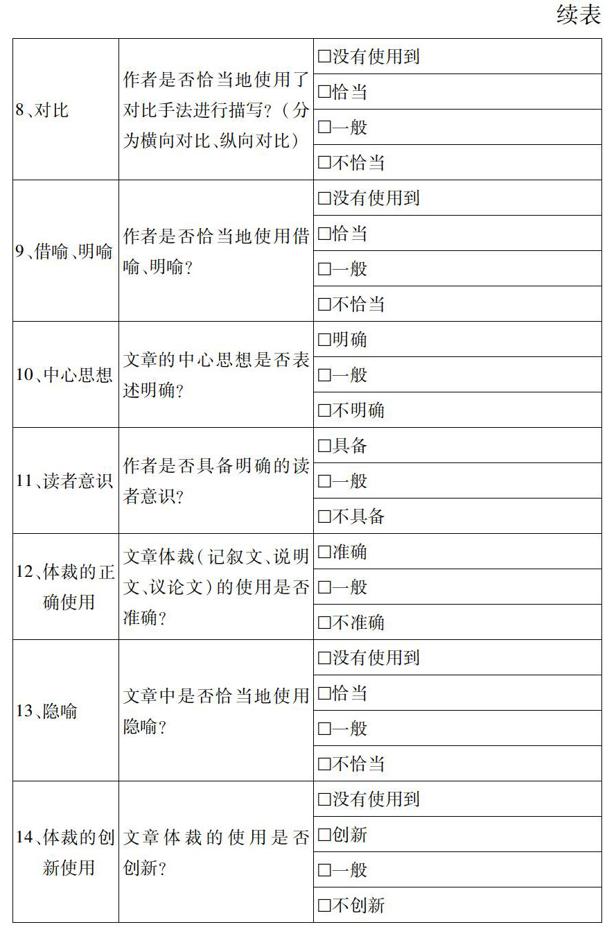 作文评价的目的在于提升学生作文水平,激发学生写作兴趣,同时改善教师教学。客观的评价标准是保障评价效果的有效手段,在语文作文教学中至关重要。本文以Biggs的创意写作要素表为基础,通过分析国内外写作差异、中英文语言差异、参考其他语文作文写作评价表以及吸取一线语文教师的修改意见,最终形成适合于三年级以上学生的作文评价标准。