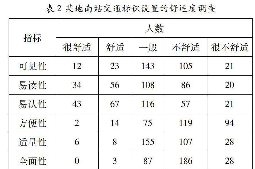 为了更好地满足出行者的出行需要,通过对某地南站交通标识设置的调查,从出行者舒适度的角度考虑交通标识设置的合理性,分别在可见性、易读性、易认性、方便性、适量性、全面性等指标分析评价了高铁站交通标识的合理性。