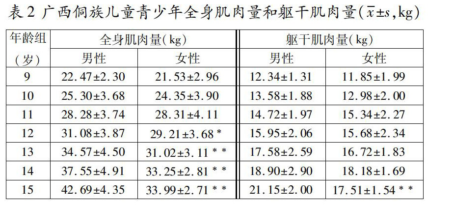 目的:应用生物电阻抗法测量广西侗族儿童青少年躯干肌肉质量、全身肌肉质量以及四肢的肌肉质量数值,探究广西侗族儿童青少年肌肉发育的分布特点以及发育规律。方法:在知情同意的情况下,随机整群抽取广西714例(女为351例,男为363例)9~15岁侗族健康儿童青少年作为研究对象,应用体成分分析仪对所有受试者进行测量,测出躯干肌肉量、全身肌肉量、左上肢肌肉量、右上肢肌肉量、左下肢肌肉量、右下肢肌肉量,所有数据均用SPSS22.0统计软件进行统计学处理。结果:广西侗族儿童青少年躯干肌肉量、全身肌肉量、左上肢肌肉量、右上肢肌肉量、左下肢肌肉量、右下肢肌肉量在一定的年龄段会随着年龄的增长而增长,男性均大于女性(P<0.05或P<0.01),并且随着年龄增长,男性肌肉量增加趋势更显著。结论:广西侗族儿童青少年肌肉含量随年龄变化特点符合一般儿童青少年发育的正常规律,且广西侗族儿童青少年肌肉发育存在有性别差异。广西侗族青少年身体各部肌肉含量与广西苗族青少年身体各部肌肉含量有一定差异。