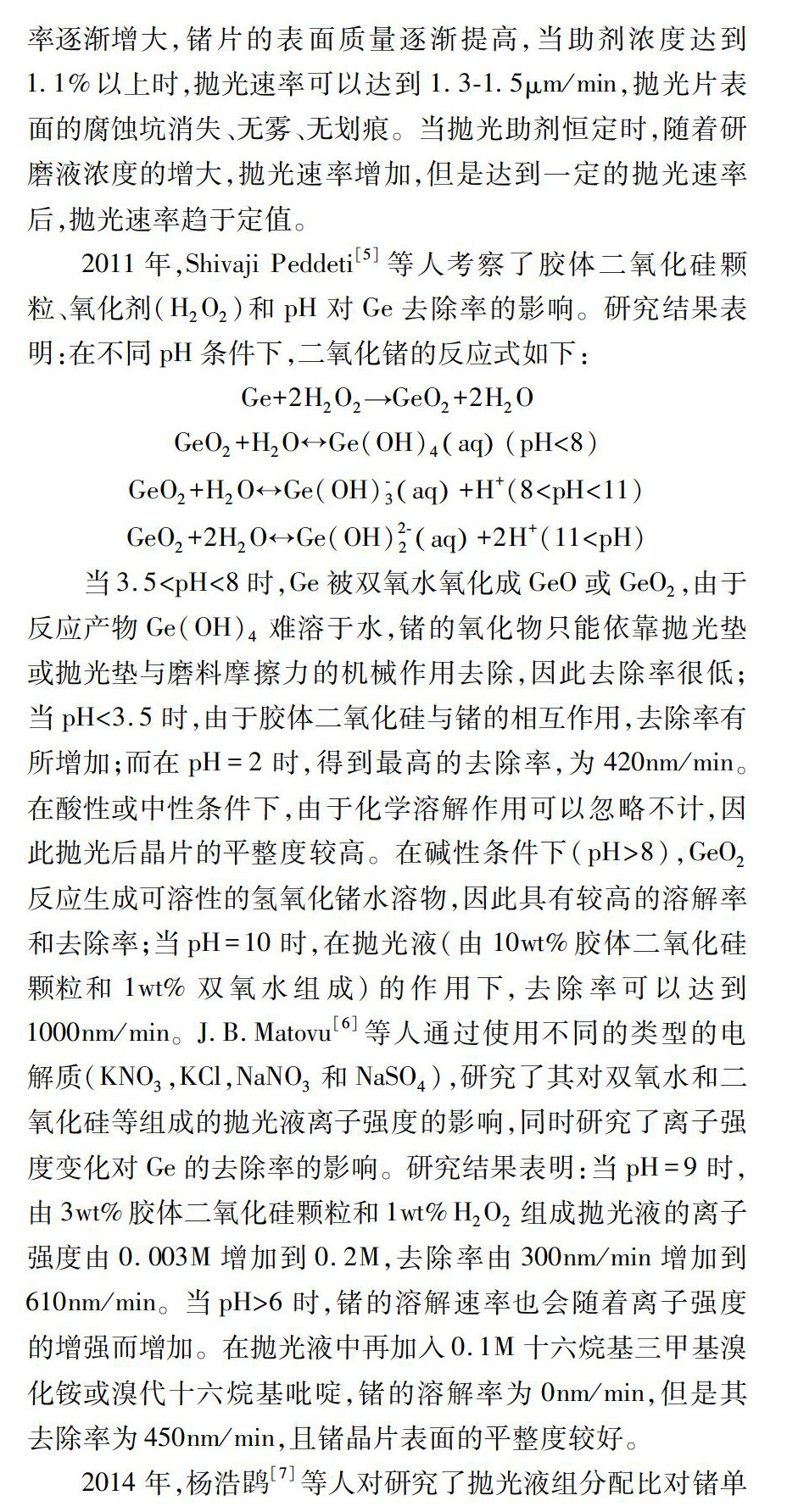 锗单晶晶片作为一种重要的外延层衬底材料被广泛应用于航天航空领域。衬底外延生长要求锗晶片表面有极低的表面粗糙度、无表面/亚表面损伤和残余应力等,需要通过对锗表面进行抛光去除表面缺陷、提高表面质量,从而满足外延生长。本文综述了锗单晶衬底抛光的技术进展,分析了抛光液组分、pH值、离子强度、抛光工艺参数等对锗片抛光质量的影响,阐述了锗晶片的化学抛光机理,指出了目前锗抛光技术中存在的问题并对其未来发展方向进行了展望。