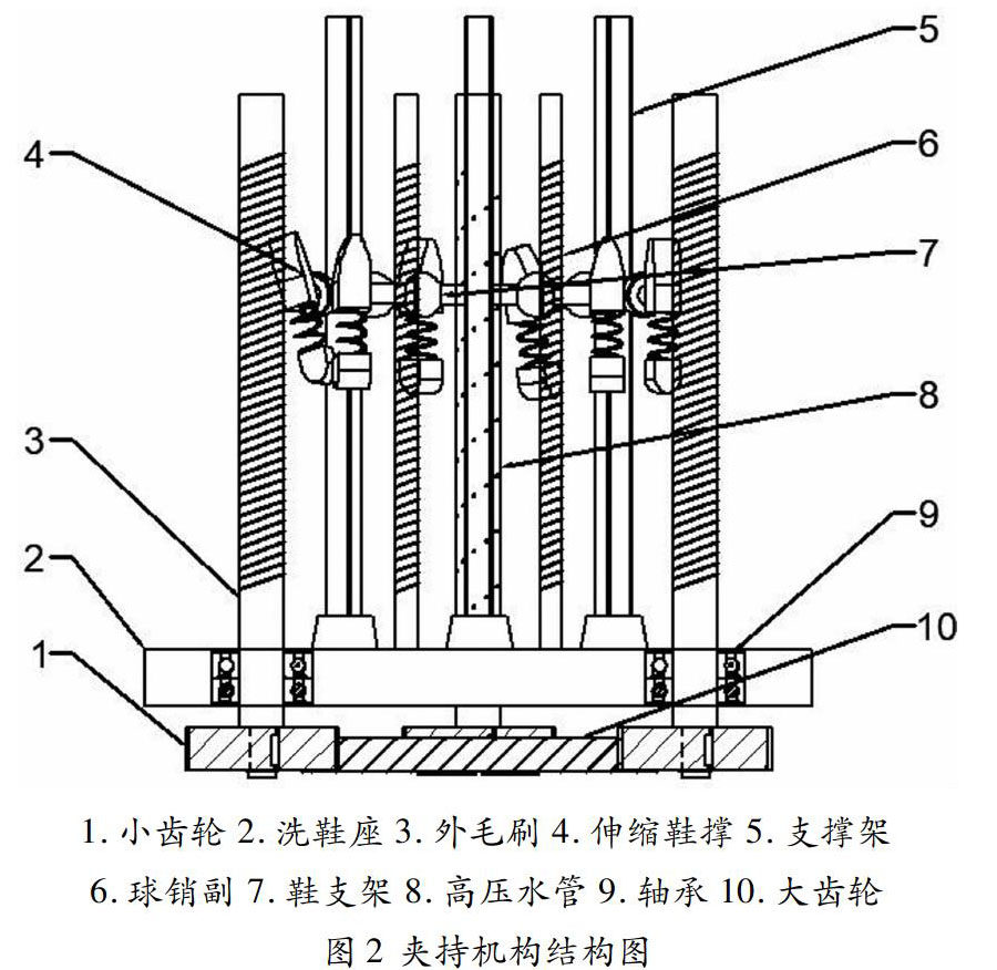 新疆南部沙尘天气比较常见,鞋子容易变脏,需要经常洗刷。针对现有洗鞋机存在的耗时、耗水、鞋子损伤较大等问题,设计一种夹持式的小型洗鞋机。该机器具有夹持和清洗两大功能。采用伸缩鞋模机构+插拔式鞋架夹持鞋子,通过齿轮机构实现对滚式毛刷机构的反向、差速转动。清洗分为两步进行,第一步采用高压水泵,通过管路喷射高压水流进行清洗,去除鞋子表面大颗粒污物。第二步,启动电机后,动力通过齿轮机构驱动毛刷旋转,转向相反、转速不同的一组毛刷分别对鞋子两侧面进行洗刷,球销副机构可以保证鞋子在不同的转向下进行往复摆动,实现无死角、全方位清洗。由于鞋子固定放置,避免鞋子直接碰撞产生的损伤,利于延长使用寿命。