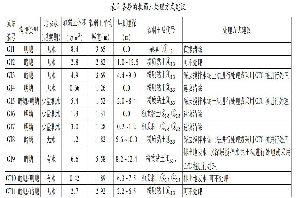 场区勘察范围内地貌上整体以剥蚀丘陵为主,局部为岩溶洼地地貌和山间槽谷地貌。在本区域范围内发育有3条大的冲沟,由若干小型支沟组成。在沟内低洼处由冲洪积、沼泽相沉积形成了分布软弱土沟塘,以及后期人工改造的水塘、水库和弃土场,软弱土主要分布于塘内,均分布于机场飞行区的填方区。根据软弱土的埋置深度、分布范围、分布厚度,按一般填土区提出技术可行、经济合理的具体处理措施建议。