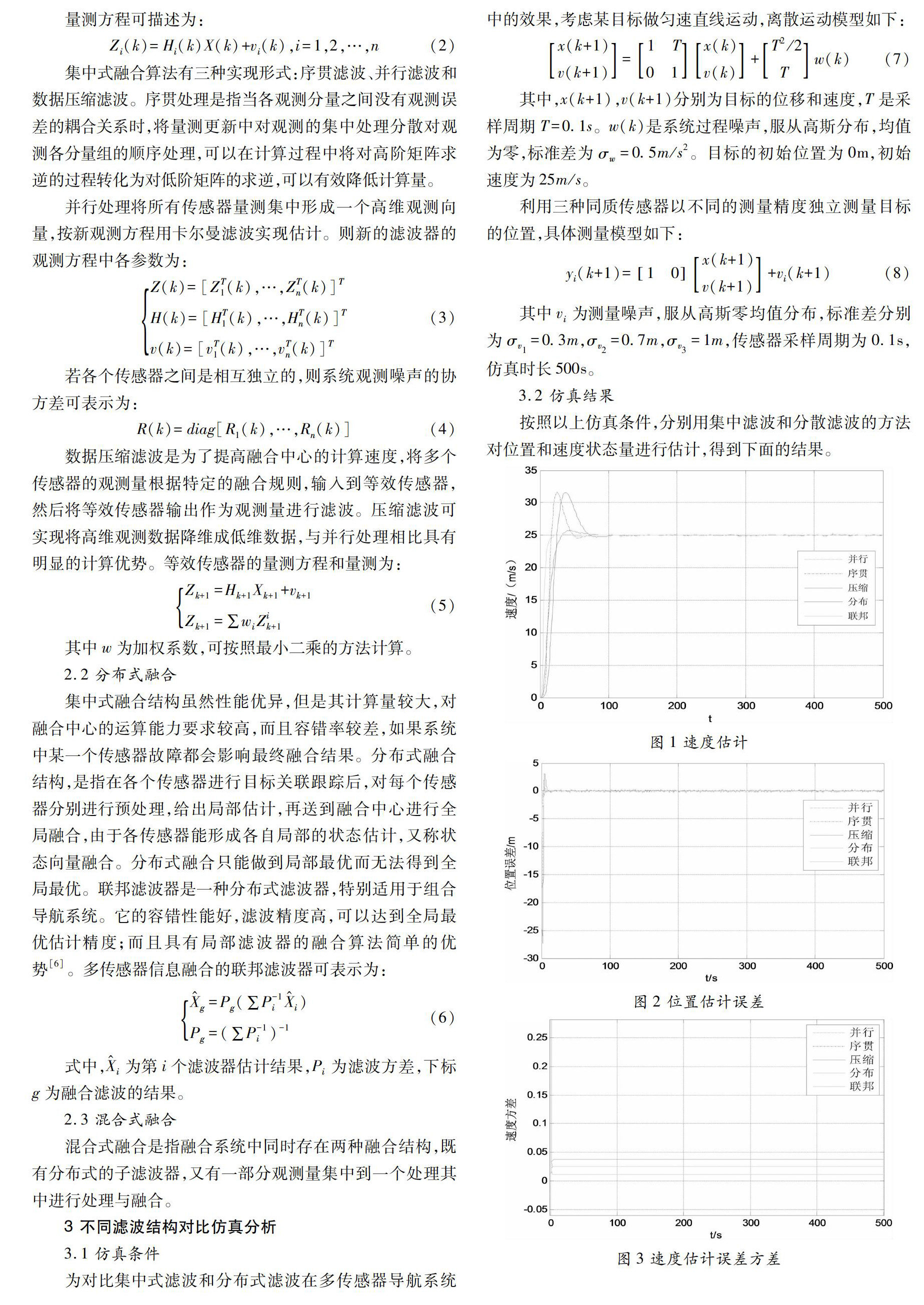 多传感器信息融合技术,是指通过对多传感器系统所获取的大量信息进行分层次、多级别的融合处理,协调拥有多个信号源的复杂应用系统中传感器相互之间的工作,能够得出更加准确、更加完善的结论,也被称为多源数据融合技术。而多传感器信息融合估计,通过利用多个传感器对同一目标进行观测,基于特定的最优融合准则将测量所得数据进行滤波处理,可以得到更精确、更可靠的融合估计结果,其精度要比单一传感器或局部估计精度高,是多传感器信息融合技术的重要组成部分。本文通过一个仿真实例分析比较了集中式融合与分布式融合对导航参数状态估计的效果,说明了状态估计在多源信息融合系统中具有重要的理论与实际应用价值。