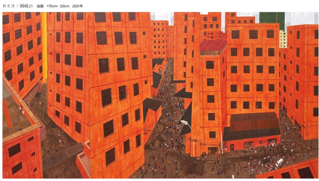 人们常说: 仰望星空,浩瀚宇宙,人生苦短——心常存敬畏之心。 俯视市井,众生碌碌,感时泪溅——心常怀怜悯之意。 俯仰,这是韩克伟观察社会的艺术角度和姿态。 画家大多有两种角度: 宏观——为天地山川立命代言,要站在一定高度方有大视野,所谓“宏大叙事”。 微观——探个人性情隐私,要脚踏实地但不能迷茫,所谓“自我意识”。 韩克伟在广西艺术学院读大三时就找到了自己观察世界的角度:俯视下城中村