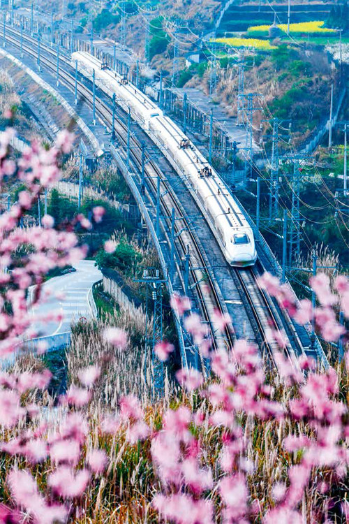 效率与公平 速度与激情 科技与美好 能够统一 点评/ 吴晓凌 2月23日,一列动车组列车在贵广高铁贵州省从江县洛香镇段附近行驶。早春时节,贵州省黔东南苗族侗族自治州境内的油菜花、桃花、樱花次第盛开,动车组列车穿行其间,一路繁花,美不胜收。新华社记者杨文斌 摄 点评:在美景里看稍纵即逝的列车,在列车里看稍纵即逝的美景。 2月24日,泰国总理巴育在曼谷素万那普机场展示中国科兴