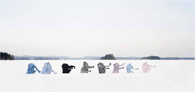 选自《风》,2000年。瑞塔·派瓦雷恩 摄 芬兰有着古老悠久的历史,拥有看似永恒的自然风光、丰富的艺术文化,但芬兰也是一个相对年轻的国家,它的身份认同感还处于较为新生的阶段。 芬兰艺术家瑞塔·派瓦雷恩(Riitta Päiväläinen)把芬兰自然风景和当地人的衣物、布料以一种独特的美学方式结合起来。在她的作品中,芬兰的严寒气候也扮演了重要的角色,那些被人丢弃的衣物在冰天雪地中重新获得了新的