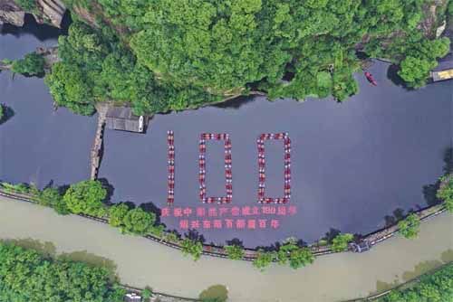 “稽山秀水古越景,百船百幅展百年”水上摄影展。章斌 摄 6月19日上午8时,在一曲悠扬的“唱支山歌给党听”的乐曲声中,浙江绍兴东湖湖面上缓缓驶来数十条乌篷船,在江南特有的濛濛细雨中,摇曳着拼出“100”字样。岸边的媒体记者和游人纷纷举起相机,无人机腾空而起,记录下碧山绿水中这一抹鲜艳的红。 “稽山秀水古越景,百船百幅展百年”水上摄影展。崔晓 摄 这是由绍兴市文化旅游集团有限公司主办,《摄影世