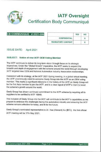 中国在世界汽车标准制定中的话语权有了新突破。 4月8日,国际汽车标准合作组织——IATF正式宣布:吉利汽车集团成为IATF国际汽车工作组第10家汽车集团成员,并拥有董事表决权。吉利将与其他9大国际汽车集团以及欧美各国汽车协会,共同参与国际质量标准制定,推动世界汽车工业可持续发展。 作为这一历史性时刻全程见证者,AIAG中国质量指导委员会(ACQAC)秘书长谢希贤博士表示:“吉利成功加入IA