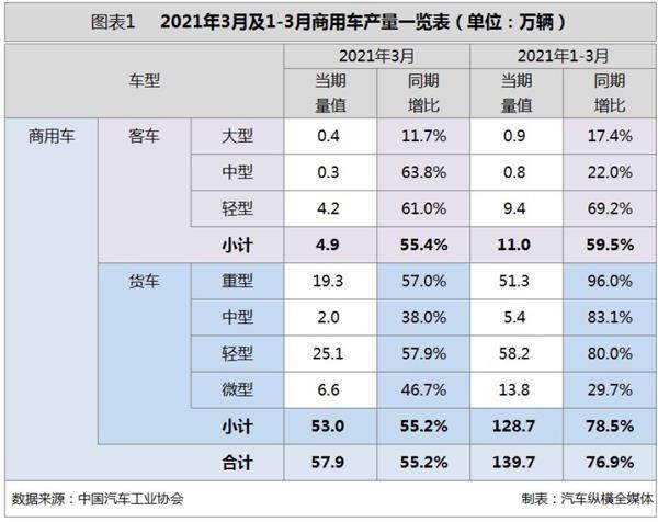 受国六标准切换、治超治限、基建项目启动等因素拉动,再加上2020年3月基数依然较低,因此今年3月商用车产销同比均呈现出大幅增长状态;其中,重型货车、轻型货车表现强劲,产销再度刷新历史最高记录,从而支撑货车和商用车产销共创历史新高。此外,在细分市场屡创佳绩的助推下,一季度商用车市场累计销量比上年前4个月数值还高出数万辆。 3月商用车产销同比大幅增长 据中汽协会统计数据显示,2021年3月,商用车