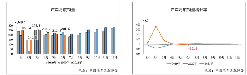 6月汽车产销同比继续下滑 据中汽协会统计数据显示,2021年6月,汽车产销量继5月份下降后,继续呈现明显回落。当月汽车产销环比分别下降4.8%和5.3%,同比分别下降16.5%和12.4%,降幅比上月分别回落9.7和9.3个百分点,这与乘用车芯片供应不足以及商用车排放标准切换不无关系。与2019年同期相比,产量同比增长2.4%,销量同比下降2.2%,产量增幅比5月回落7.9个百分点,销量增速较5
