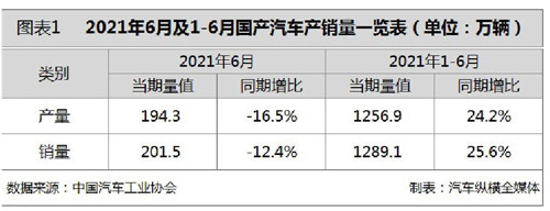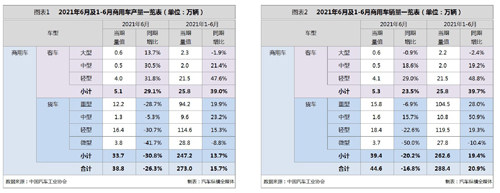 根据中国汽车工业协会的统计数据,2021年1-6月,汽车产销分别完成1256.9万辆和1289.1万辆,同比分别增长24.2%和25.6%,与2019年同期相比,产销同比分别增长3.4%和4.4%。 1-6月,乘用车产销分别完成984.0万辆和1000.7万辆,同比分别增长26.8%和27.0%。与2019年同期相比,产销同比分别下降1.6%和1.4%。 1-6月,商用车产销分别完成273.0