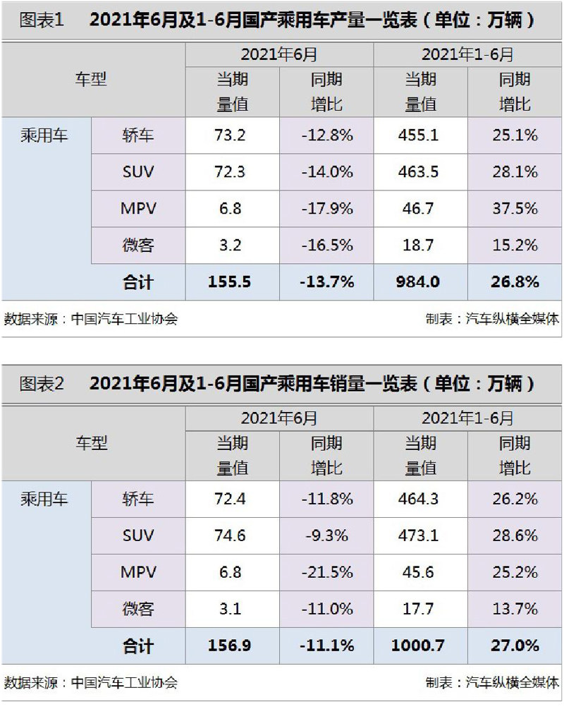 从今年上半年市场情况来看,在芯片短缺、原材料价格上涨等诸多不利因素的影响下,近几月乘用车产销量连续下滑,但1-6月累计销量依然突破了千万辆,同比增长两成以上。上半年之所以能有高增长表现主要在于去年同期全国乘用车市场下滑的低基数效应。 6月乘用车产销环、同比齐降 2021年6月,乘用车产销环、同比均呈现下降,同比降幅比上月明显扩大。据中汽协会统计数据显示,当月乘用车产销分别完成155.5万辆