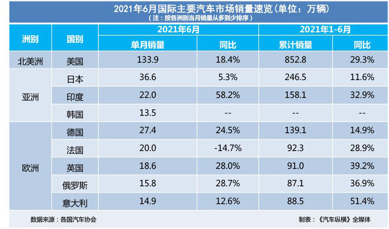 6月全球多数国家汽车销量正增长