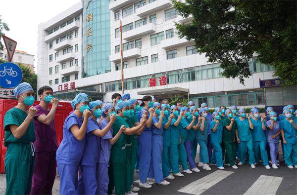 广州青年防疫应急志愿者储备队副队长谢栋兴(右一)和他的队员们(共青团广州市委员会供图) 芳村,解封! 6月24日下午14点,广州荔湾区芳村片区解封(鹤园小区除外),正式恢复对外人员和交通通行。汽车驶上珠江大桥,现场围观的市民不约而同齐呼:“解封了”;鹤洞大桥旁,执勤交警移开路障;医护人员大巴驶离芳村,市民驾车驶出芳村上班,志愿者作出胜利的手势;在芳村往鹤洞大桥的上桥口位置,一位司机摇下车窗向路