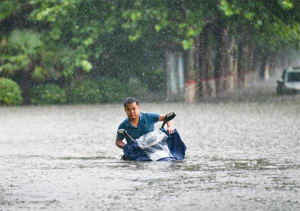7月20日,郑州市民在积水中前行(侯建勋/摄) 7月26日上午,国务院总理李克强在国家防汛抗旱总指挥部主持召开视频会议,研究做好当前和下一步抗洪抢险救灾和防汛工作。 李克强说,要突出重点,加强薄弱环节。密切雨情汛情和台风监测预报,强化预警响应机制,做到及时预警、及时反应,提高应急处置能力和群众自我防护意识。紧急情况下,针对城市严重内涝,要及时组织群众避险,除特殊行业外果断实施停工停学停业,保障
