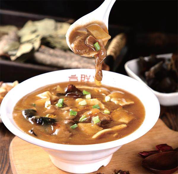 河南胡辣汤(陈茁/摄) 一碗酱色的、稠乎乎的咸汤,冒着辛辣的香气,几块牛羊肉、几片面筋、几根黄花菜、一把粉条埋伏在汤汁里若隐若现……这种其貌不扬的食物,就是河南人的最爱——胡辣汤。 初见胡辣汤,不少人外地人常常望而却步。但对河南人来说,胡辣汤有着神奇的魔力,令人欲罢不能,如若几天不喝,就会魂不守舍。 于是,无论春夏秋冬,只要一到早餐时间,在河南各地大街小巷数不清的胡辣汤店门口,几乎都会上演排