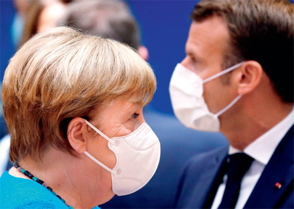 2020年7月18日,在比利时布鲁塞尔的欧盟总部,出席欧盟峰会的德国总理默克尔(左)和法国总统马克龙。 2020年即使政治事态加速发展,世界各国民众仍然经历了慢动作般的一年。对欧盟而言,应对新冠疫情一直充满挑战;但尽管存在诸多反对意见,欧洲人不仅团结在一起,而且成长在一起,也更有凝聚力。2021年,全球合作应大有可为,而欧盟则应继续奉行战略自主政策,以便能够在未来数年乃至数十年内捍卫自身利益。