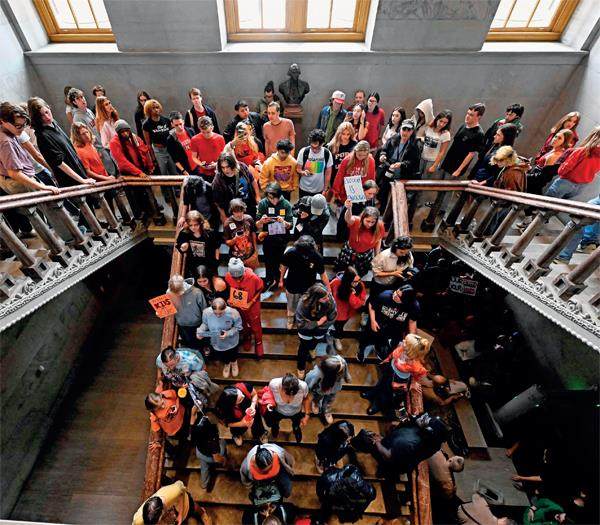 4月3日,美目田纳西州,数百青少年及学生家长聚集在议会大厦抗议枪支暴力,并要求制定更严格的枪支管制法律。 3月27日,美目田纳西州纳什维尔市发生校目枪击案,造成包括3名儿童在内6人遇害。今年以来,美国已发生130起造成至少4人死伤的大规模枪击事件。图/视觉中国