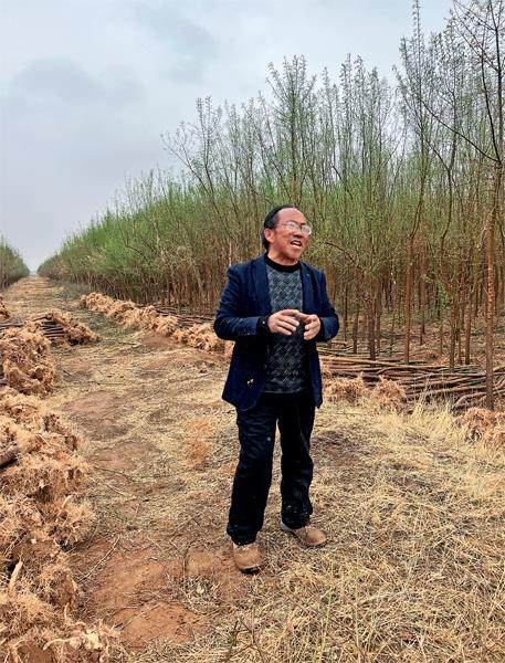 孙国友在他的“苗圃基地”。这个基地在距离马家滩林场约50公里的狼皮子梁乡。摄影/本刊记者 刘向南 从宁夏灵武市区出发,汽车沿着蜿蜒于山丘间的公路朝东北方向行驶,大约一个小时,就可以到马家滩镇政府所在的马家滩村。在马家滩村的东北方,就是孙国友承包的万亩荒沙地。 这里正是“跪地求水”风波的“风暴眼”。 一座贴着白瓷砖的平房坐落在林地的白杨树林中。一连几日,皮肤黝黑、情绪激动的孙国友都在这里接待一