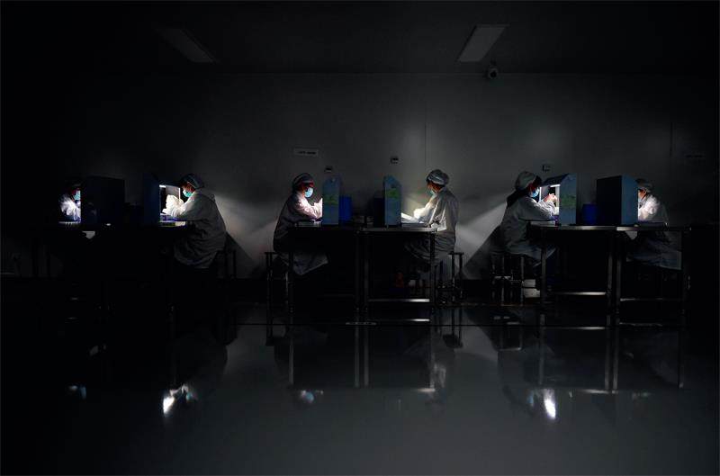 5月20日,安徽合肥市一家生物制药公司内,工作人员在新冠疫苗生产线上对疫苗进行人工检测。图/新华