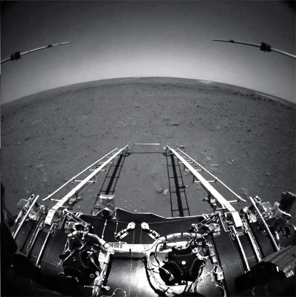 5月19日,中国国家航天局发布天问一号任务探测器着陆过程两器分离和着陆后“祝融号”火星车拍摄的影像,图像由火星车前避障相机拍摄,正对火星车前进方向。图中可见坡道机构展开正常;图像上部的两个伸杆为已经展开到位的次表层雷达;前进方向地形清晰。图/中国国家航天局 5月22日,国家航天局发布“祝融号”火星车携带的前避障相机和后避障相机拍摄的驶离着陆平台过程,这些最新的火星表面影像,让全世界共同见证:“祝