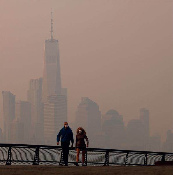 6月8日,美国纽约哈德逊河附近,人们戴着口罩出行,远处是烟雾笼罩下的曼哈顿下城和世贸中心一号楼等建筑群。加拿大野火持续了多日,其产生的烟雾飘至美国东部地区,华盛顿和纽约等地被烟尘笼罩,多地空气质量拉响警报。 图/视觉中国