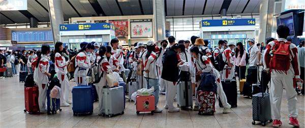 6月5日早上7点多,北京南站已经挤满了一波又一波出省研学的学生团:短短一个小时,来自五所中小学的几百人相继踏上了去往上海、黄山等地的列车。摄影/本刊记者 李明子 2023年高考的两天前,一大早,北京南站已经挤满了一波又一波出省研学的学生团。短短一个小时,来自五所中小学的几百人相继踏上了去往上海、黄山等地的列车。 “现在是暑假前的研学小高峰,很多学校被选为考场,不能上课,正好外出研学。”北京微创