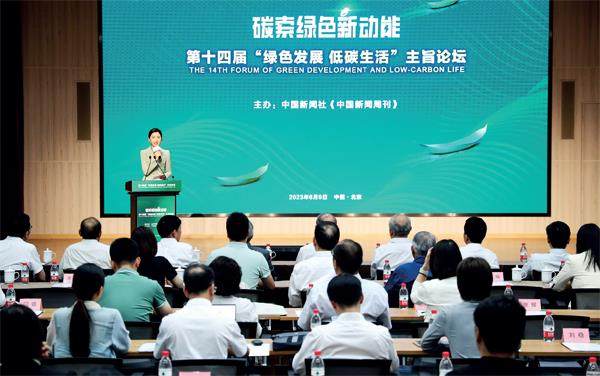 第十四届“绿色发展 低碳生活”主旨论坛活动现场。 党的二十大报告指出,推动经济社会发展绿色化、低碳化是实现高质量发展的关键环节。6月9日,由中国新闻社《中国新闻周刊》主办,生态环境部、北京市人民政府指导的第十四届“绿色发展 低碳生活”主旨论坛在京举办。本届论坛主题为“‘碳’索绿色新动能”,政产学研各界嘉宾为积极有序推进绿色转型群策群力。 中国气候变化事务特使解振华,国家发展改革委原副秘书长苏伟