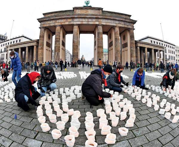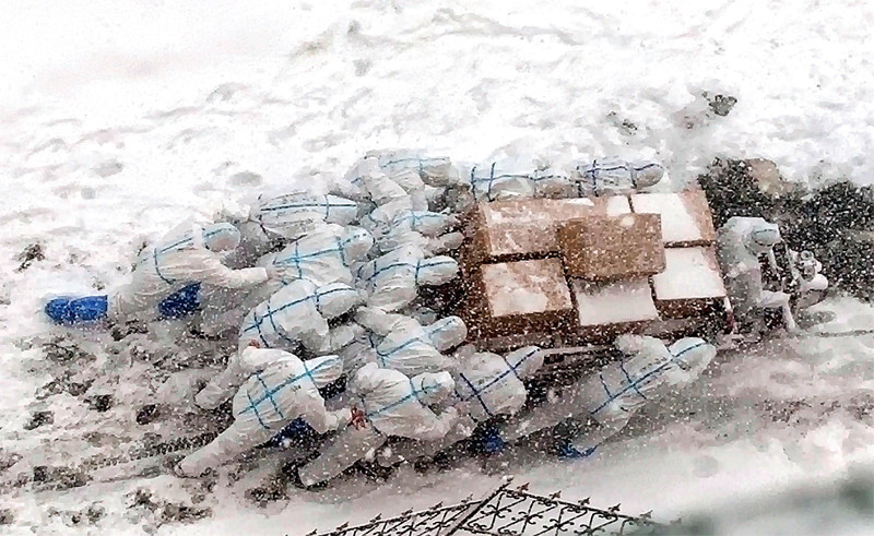 2021年1月6日下午,大连海洋欠学的志愿者们推着满载的三轮车上坡,将物资送到学生宿舍。2020年12月21日,为应对新冠肺炎疫情,大连海洋大学封闭校园,学生在宿舍隔离,该校17名平均年龄19岁的学生加入志愿者队伍,与教职工志愿者一起负责公寓区域师生一日三餐、生活和防疫物资的统一配送。图/大连海洋大学 拂晓除冰 2020年12月29日,大庆萨尔图机场管理有限公司的机务工程师为飞机除防冰。冬日的