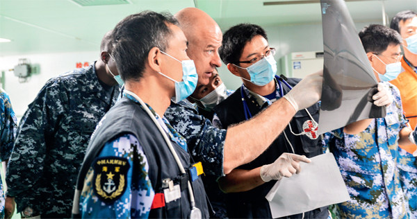 2014年7月15日,共同参加“环太平洋-2014”演习的中国和平方舟医院船与美国“仁慈”号医院船,双方互派三批各6名医务人员到对方的医院船进行为期4天的“驻船见学”。图/新华 2013年9月6日,由中国海军导弹驱逐舰青岛舰、导弹护卫舰临沂舰和远洋综合补给舰洪泽湖舰组成的113舰艇编队,抵达美国夏威夷珍珠港,开始为期3天的友好访问。夏威夷少女为中国海军舰艇编队指挥员、北海舰队参谋长魏钢海军少将戴