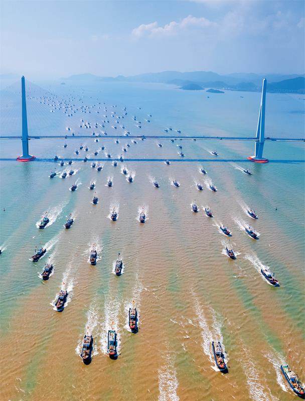 9月16日中午,东海伏季休渔结束,全面“开渔”。浙江宁波象山近2000艘渔船驶出港口,赴东海进行捕捞作业。图/IC