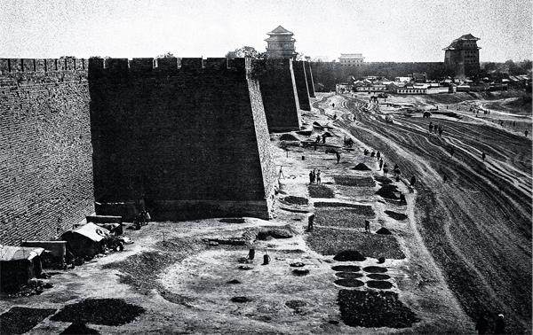 1875年前后,北京内城外的景象。远处是正阳门及其箭楼。高墙下铺着有规则的几何图形,是晾晒的畜粪,墙角下有晒粪人临时搭建的窝棚。图/FOTOE 朱祖希清晰记得初见北京城的情形。1955年,朱祖希以第一志愿考取北京大学地质地理系,他告别故乡浙江,乘坐汽车、火车,经过几天几夜的颠簸,到了前门火车站,高大的正阳门城楼蓦然出现在眼前,让他震动。 从南端的永定门、正阳门,穿过古都北京的外城、内城、皇城、