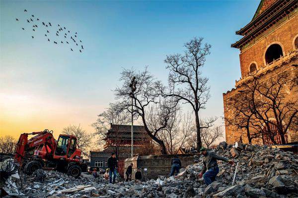 2014年12月8日,北京钟楼湾胡同原32号院,工人们正在清理施工垃圾。摄影/张洁 尽管家住北京四环外,但在周末,秦红岭喜欢换三趟地铁,进入二环里的老城区,在钟鼓楼及与其相连的什刹海周边漫步。她是北京建筑大学人文学院院长,写了多部有关建筑伦理与城市文化的专著。穿梭在钟鼓楼前的市井中,在她眼中,是“感受老北京魅力和人文气息的过程”。 北京的老城凸字形城廓中央,一条15华里(约7.8公里)的中轴线