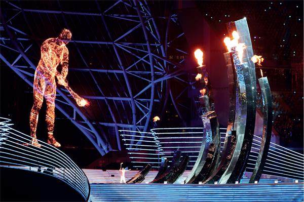 9月23日,杭州第19届亚运会开幕式在浙江杭州奥体中心体育场举行。火炬手汪顺与数字火炬手共同点燃主火炬。摄影/本刊记者 盛佳鹏 2023年9月23日晚,潮水奔涌的钱塘江畔,第19届亚运会开幕式在杭州奥体中心体育场盛大举办。在五彩斑斓的探照灯光照耀下,“大莲花”绽放光芒,杭州奥体中心体育馆和游泳馆犹如振翅欲飞的彩色蝴蝶。 作为党的二十大胜利召开后中国举办的规模最大、水平最高的国际综合性体育赛事,