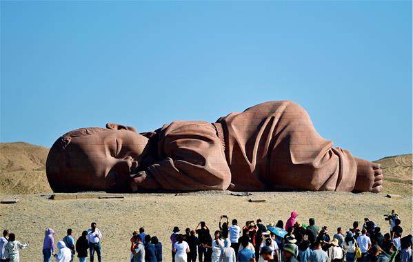 9月8日,甘肃酒泉市瓜州县戈壁国际雕塑艺术长廊上,游客在大型雕塑《大地之子》前游览。摄影/本刊记者 李亚龙 距离十一黄金周还有好几天,新疆康辉大自然国际旅行社的薛翊冰已经忙得不可开交。“拼车每天70车,一车6个人,一共420人,大团这里又100多……每天差不多1200人……”薛翊冰忙着计算日接到并出发的人数。从9月15日开始一直持续到黄金周中期,几乎每天,他和团队都要接待超过1千人。 从8月开