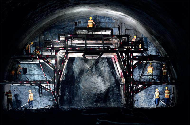 10月3日,国庆假日期间,中铁五局施工人员奋战在宣绩铁路独山隧道内。当日,由中铁十一局承建的贵南高铁长坡二号隧道顺利贯通。该隧道位于贵州独山县境内,全长4560余来。图/新华