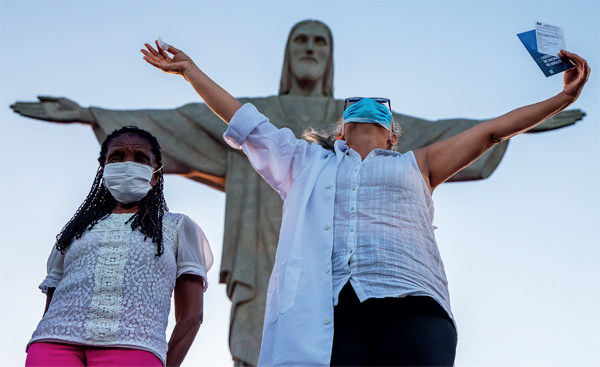 1月18日,巴西正式在全国开始新冠疫苗接种。在巴西里约热内卢,一家福利院的80岁老人特雷济尼亚·达孔塞桑(左)和59岁护士杜尔西内亚,达席尔瓦·洛佩斯,在接种中国北京科兴中维生物技术有限公司研发的新冠疫苗克尔来福后庆祝。图/人民视觉 疫苗推进速度决定人类与新冠疫情对决的未来。疫苗接种速度越快,就越能有效控制疫情,病毒变异的速度就难以跟上疾病防控的速度。但在这一过程中,新冠疫苗的保护效力、产能、接