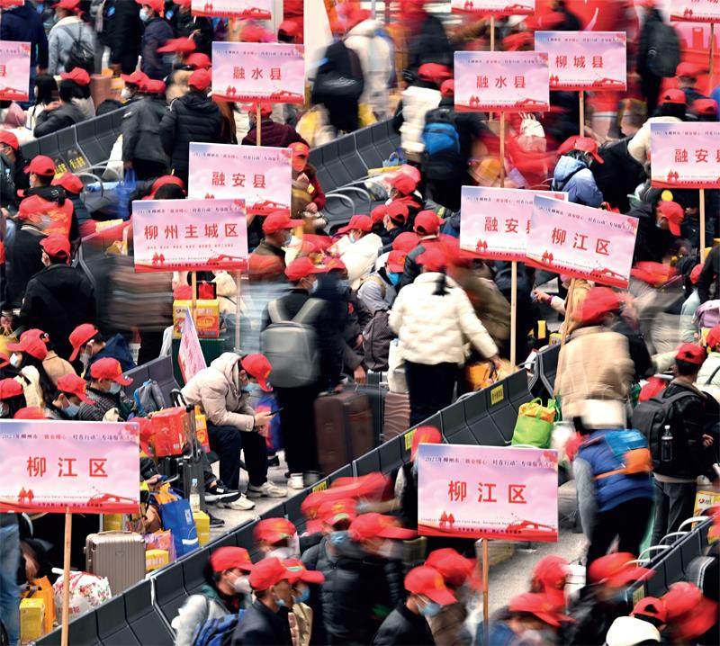 1月30日,2023年广西柳州市首趟“点对点”送工服务专列D3755次列车从柳州火车站发车,500多名来自柳州市各县区的务工人员乘坐动车前往广东返岗复工。摄影/黎寒池