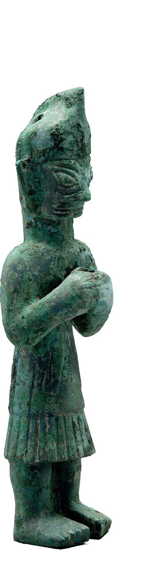 戴尖帽铜立人像,三星堆遗址3号坑出土。 扭头跪坐铜人像,三星堆遗址4号坑出土。本版图/四川考古研究院 中国青铜时代,涵盖于夏商周三代之中,与中国王朝的诞生几乎同步。 在西北和中原,近年都新发现了距今四千多年乃至更早的铜器。 这些发现,勾勒出一幅更清晰的中国青铜时代全景 三星堆又上新了。2020年启动发掘的三星堆遗址四号坑里,出现了三个从未见过的“小铜人”。“小铜人”造型奇特,膝盖跪地,双