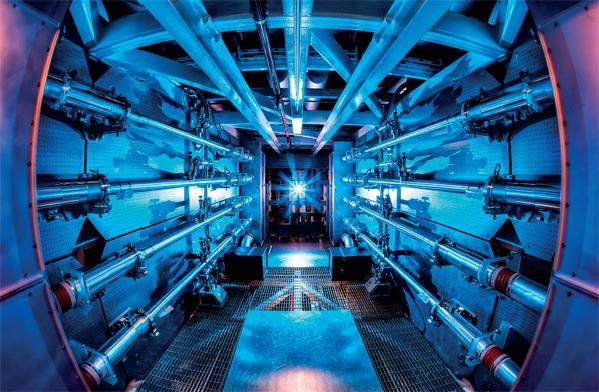 美国劳伦斯利弗莫尔国家实验室的国家点火设施内部,这是一个基于激光的惯性约束聚变研究设施。图/LLNL 当192束超高能量的激光束同时轰击一颗胡椒粒大小、装有氘和氚元素的圆柱体时,会产生什么结果? 当地时间12月5日,美国劳伦斯利弗莫尔国家实验室(LLNL)开展了这项实验,“奇迹”发生了。激光束为圆柱体提供2.05 兆焦耳的能量后,输出了3.15兆焦耳的核聚变能量。12月13日上午,美国能源部与