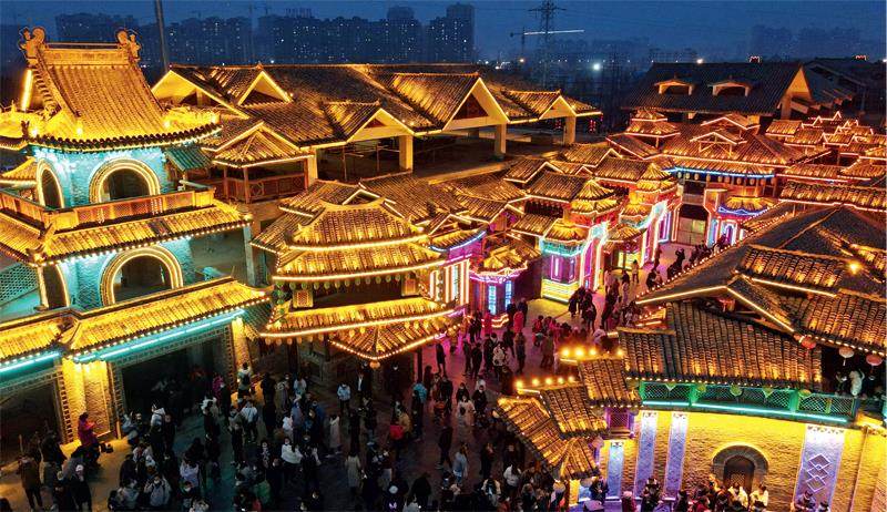 2月14日,陕西西安市周至县,免费开放的周至水街一一烟火巷子灯光璀璨、夜景迷人,为元宵佳节增添了喜庆氛围。图/视觉中国