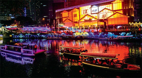 锦江被“点亮”,市民和游客乘乌篷船赏景。 在成都最繁华的市中心,有一座百年公园——人民公园。这里既是外地人游成都的打卡地,也是老成都人最热爱的休憩地,这里有成都人民最烟火的生活。 美国西雅图小伙江喃就是人民公园的常客。23年前他来到成都,如今早已是一口流畅的成都话。每当空闲,他总像个“老成都”一样去人民公园茶社里坐坐。 公园茶社里,竹椅、矮桌、铜茶壶、盖碗茶,与绿植、湖水融为一体,有一份雅致