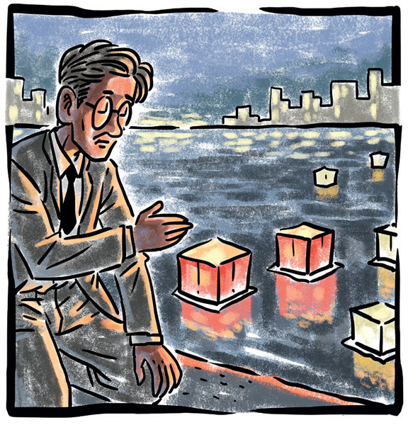 大江健三郎的长子光是一个残疾儿,出生后,医生告诉他儿子存活的概率是很小的。大江健三郎为此痛不欲生,他将儿子的名字写在灯笼上让它在河里漂流。 在广岛旅行时,他发现原子弹幸存者就是这样:把死者的名字写在灯笼上,他们注视着灯笼流向河对岸——死者的灵魂进入黑暗之中。一位朋友的女儿在广岛原子弹爆炸后死去,对他讲:你不该做那种多愁善感的事情,你得不停地工作。 后来,大江健三郎承认自己做的事情是最为糟糕的那