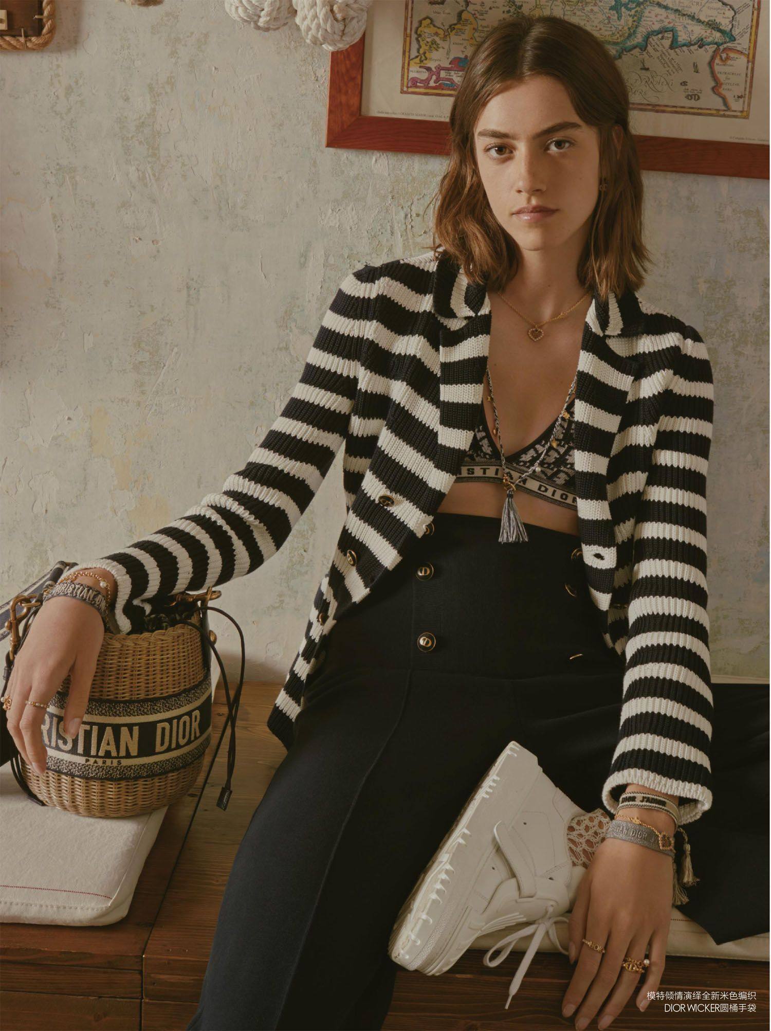 白色短袖衬衫条纹系带背心条纹高腰半裙灰色毛毡帽黑色中筒靴均为DIORRose Céleste系列项链、手链Rose des vents系列项链、手链均为Dior高级珠宝 从酒店驱车到拍摄的森林公园,全程30公里有余,需一小时左右时间。前一天晚收工并没有影响赵丽颖的拍摄状态,工作节奏之顺畅,流程之紧凑令在场所有人惊诧:赵丽颖入镜,飞速进入状态,自快门声响起到一套造型拍摄完成,不过十来分