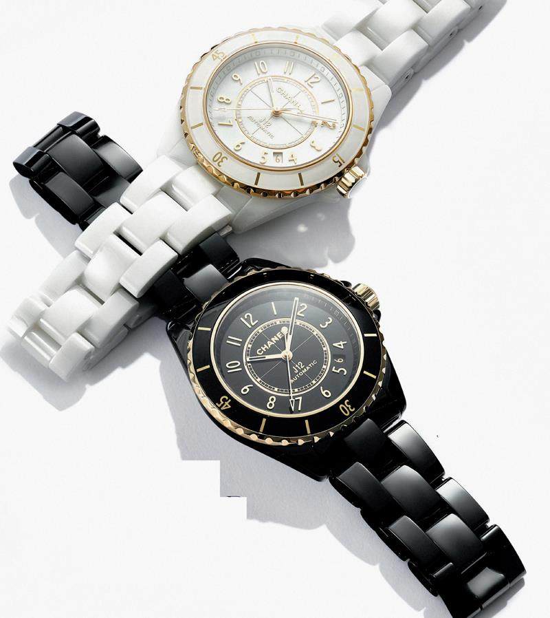 全新推出的J12 Caliber 12.1腕表首次以黄18K金装饰,为J12这款标志性的腕表再增加了新设计元素,彰显其刚柔并济的设计风格。黄18K金材质的装饰既内敛又吸睛,除了表圈与表冠,表盘上同样运用黄K金镀金设计,精致地点缀在指针、时标和切面处。除了精致外观,腕表内部运用Caliber 12.1自动上链机械机芯,这枚机芯代表了Chanel高级制表成就,这也是其自推出以来,首次以黄K金镀于摆