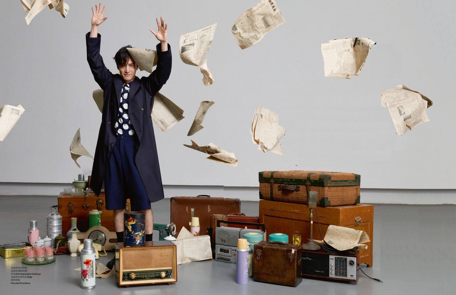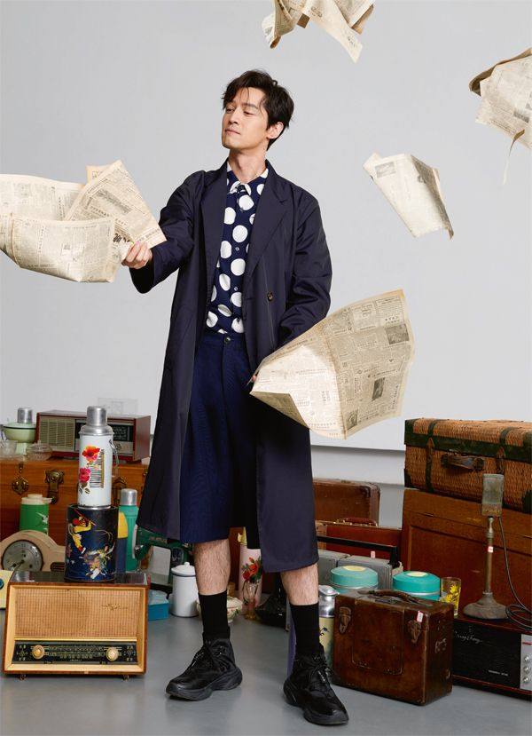 宝蓝色波点短袖宝蓝色阔腿短裤均为AMI Alexandre Mattiussi深蓝色长款风衣Bally黑色球鞋MonsterGuardians 拍摄间隙,胡歌认真地看起了报纸,还念出某一段落,与大家讨论 用热水瓶插花的创意出自于胡歌本人,此刻,他正享受着被鲜花簇拥的美丽待遇 黑色格纹西装外套黑色格纹西装长裤蓝色格纹衬衫午夜蓝领带黑色皮鞋均为Giorgio Arman 我们的拍摄以上海为