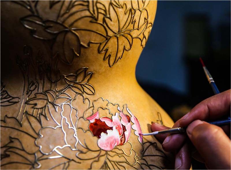 彩绘 “ 绵绵瓜瓞, 民之初生” 出自《诗经· 大雅·绵》,反映的正是源于远古的葫芦崇拜。作为中国传统文化的符号,葫芦有着悠久的历史,籽粒众多,喻意代代传承;圆形外廓,蕴含和谐美满;谐音“福禄”,象征富贵吉祥。“一瓢藏造化,天地一壶中”,葫芦可以说是中华民族最原始的吉祥物。在山西省阳泉市矿区,有一对结缘葫芦的伉俪——张建维、宋红梅夫妇,他们以葫芦为纸,妙手著锦,匠心雕琢,让葫芦焕发了新的生命。