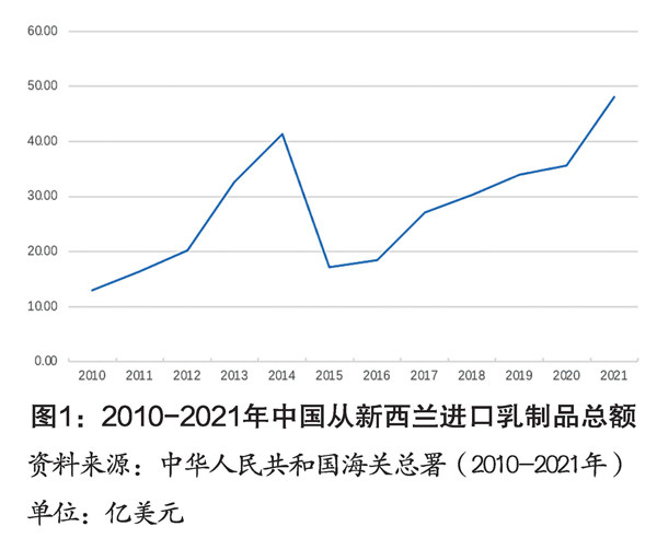 本文基于2010-2021年中国进口新西兰乳制品的相关数据,较为详细地描述了中国从新西兰进口乳制品的发展趋势以及存在的问题,结合中新两国贸易政策,深入探究形成此贸易格局的原因,并依据本文的结论,对提升中国乳制品国际竞争力提出相关建议。 一、中国进口新西兰乳制品的现状 中国是乳制品生产、消费、贸易大国,随着中国人消费水平的提高以及消费结构的变化,人们更追求饮食结构的健康,其中对优质乳制品的需求逐